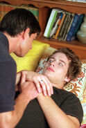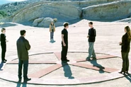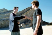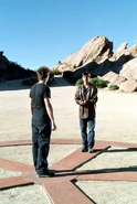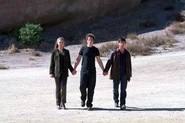 Max says he held out his hand for Michael to join them, but Michael ran off into the desert. Max and Isabel then didn't see Michael again for three years. Back in Roswell, Maria helps Isabel take care of Michael who has begun to hallucinate. Michael sees himself in the desert, surrounded by the symbols of the cave painting. Michael follows the symbols to a sepulcher, which contains himself inside. Max and Liz soon find River Dog, who tells them to bring Michael to him at the cave. Once there, River Dog surrounds Michael's body with stones the fourth alien, Nasedo gave him. River Dog tells them the stones are from their home planet. River Dog explains Nasedo went through a similar sickness, and was healed with the stones. Max, Liz, Maria, Isabel and Alex must all hold the stones to restore Michael's balance.